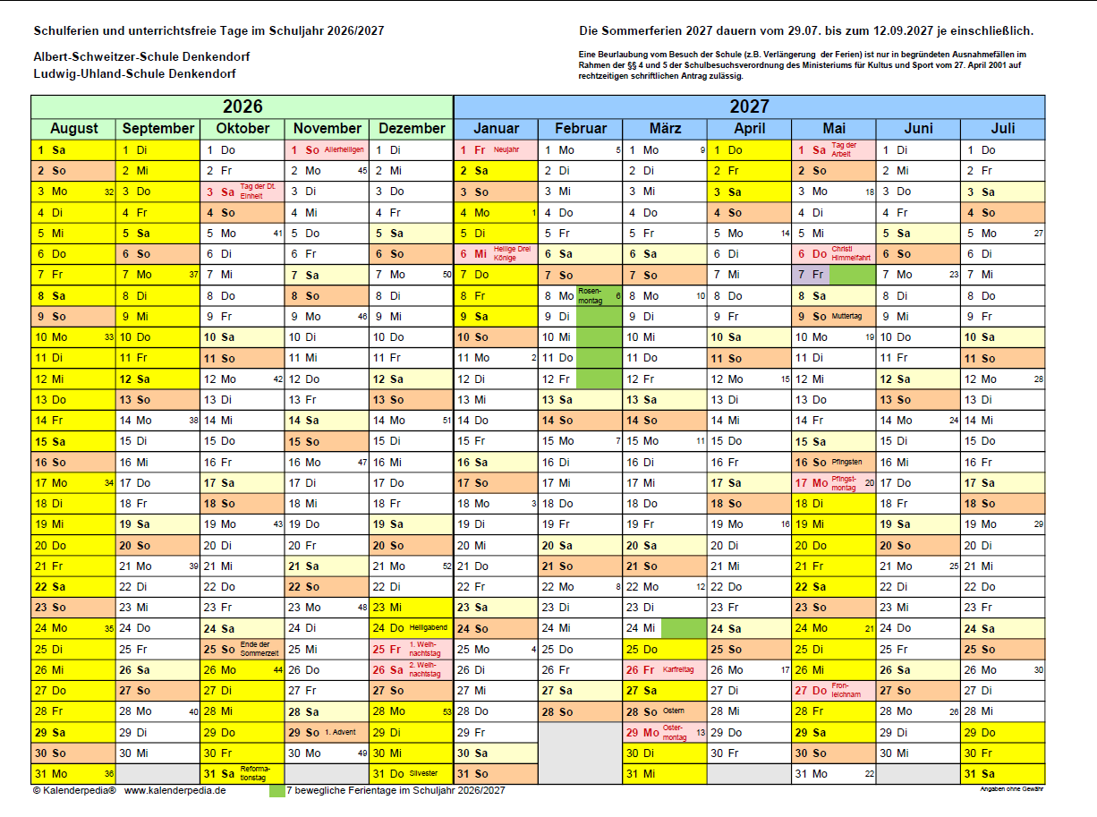 Schulferien und unterrichtsfreie Tage im Schuljahr 2026/2027